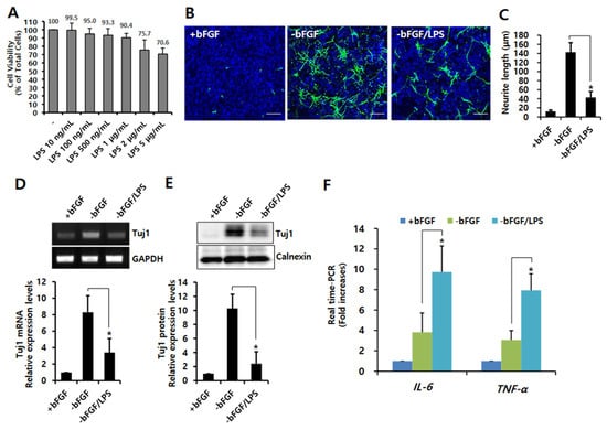 In order to determine the non-toxic concentration of LPS in NSCs, cells were treated with various concentrations of LPS in the absence of bFGF. As shown in Figure 1A, there was no cytotoxicity by showing a cell viability of 90.4% at 1 μg/mL of LPS. Therefore, we used this concentration in the following experiments. Neurite outgrowth is one of the typical morphological changes that occurs during neuronal differentiation. In order to investigate the effect of LPS on neurite outgrowth in NSCs, cells were treated with LPS (1 μg/mL) after bFGF removal. After 3 days, the cells were immunochemically stained using antibodies against a neuronal marker (Tuj1). Tuj1-stained cells fluoresce green. As shown in Figure 1B,C, LPS treatment significantly inhibited neurite outgrowth compared to bFGF removal cells (p < 0.05). The mRNA and protein levels of Tuj1 were also reduced by LPS treatment after bFGF removal (Figure 1D,E), indicating that LPS attenuates neuronal differentiation. It is widely accepted that LPS is related closely to neuroinflammation; therefore, we examined whether LPS leads to neuroinflammation in NSCs. As shown in Supplementary Figure S1A,B,F, the expression of pro-inflammatory cytokines IL-6 and TNF-α increased from 100 ng/mL of LPS concentration, and their expressions markedly (p < 0.05) increased by LPS treatment (1 μg/mL) in the absence of bFGF. Taken together, these results indicate that LPS-induced neuroinflammation affects the neuronal differentiation of NSCs.