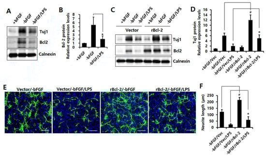 Effect of Bcl-2 overexpression on LPS-induced neuronal damage in NSCs. (A,B) NSCs were treated with LPS (1 μg/mL) for 1 day in the absence of bFGF. (A) Western blotting was performed using anti-Tuj1, anti-Bcl-2, or anti-calnexin antibodies to detect the respective protein bands. (B) Band intensity was quantified with Quantity Ones® software. Data are shown as means ± SD. * p < 0.05 compared with –bFGF control. (C,D) MSCV-IRES-EGFP or rBcl-2-MSCV-IRES-EGFP was transfected into the NSCs for 48 h, then the cells were treated with LPS (1 μg/mL) for 1 day in the absence of bFGF. (C) Western blotting was performed using anti-Tuj1, anti-Bcl-2, or anti-calnexin antibodies to detect the respective protein bands. (D) Band intensity was quantified with Quantity Ones® software. Data are shown as means ± SD. * p < 0.05 compared with –bFGF/Vector/LPS control. # p < 0.05 compared with –bFGF/Vector control. (E,F) MSCV-IRES-EGFP or rBcl-2-MSCV-IRES-EGFP was transfected into the NSCs for 48 h, and the cells were treated with LPS (1 μg/mL) for 3 days in the absence of bFGF. The NSCs were stained with anti-Tuj1(green) and DAPI (blue). Scale bar: 100 μm. (F) Neurite lengths were measured in randomly selected fields using three independent experiments; n = 3 per group. Data are shown as means ± SD. * p < 0.05 compared with –bFGF/Vector/LPS control. # p < 0.05 compared with –bFGF/Vector control. Statistical significances were assessed by one-way ANOVA with a post hoc Tukey’s test.