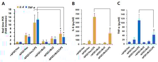 We previously reported that Bcl-2 is required for neuronal differentiation [,]. Bcl-2 has also been shown to influence neuronal apoptosis through neuroprotective functions []. Therefore, we investigated whether Bcl-2 has a protective effect on the LPS-induced neuroinflammation in NSCs. First, we showed that Bcl-2 expression increased during neuronal differentiation (Supplementary Figure S2), whereas LPS inhibited Bcl-2 expression (Figure 2A,B). Moreover, we found that Tuj1 expression levels were increased by Bcl-2 overexpression compared to vector control cells in the absence of bFGF or with LPS (Figure 2C,D). Furthermore, Bcl-2 overexpression also enhanced neurite outgrowth compared to vector control cells in the absence of bFGF or with LPS. (Figure 2E,F). We also assessed the levels of pro-inflammatory cytokines in the Bcl-2-overexpressing NSCs, in order to confirm whether Bcl-2 could inhibit LPS-induced neuroinflammation. As shown in Figure 3A, Bcl-2 overexpression dramatically (p < 0.05) decreased IL-6 and TNF-α mRNA levels compared to vector control cells in the absence of bFGF or with LPS. Furthermore, we showed that LPS-induced pro-inflammatory cytokines, IL-6 and TNF-α, were suppressed by Bcl-2 overexpression compared to vector control in the absence of bFGF with LPS (Figure 3B,C). These data suggest that Bcl-2 has a neuroprotective effect on LPS-induced neuroinflammation in NSCs by blocking the production of pro-inflammatory cytokines.