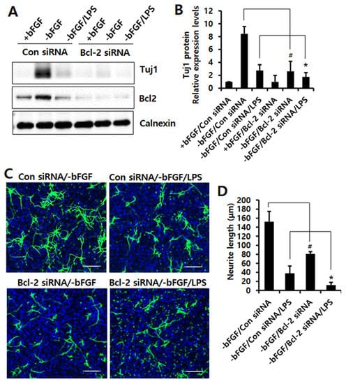 Next, we transfected control or Bcl-2 siRNA into NSCs to confirm the neuroprotective role of Bcl-2 in LPS-induced neuroinflammation. As shown in Figure 4A,B, Bcl-2 knockdown efficiently decreased the expression levels of Tuj1 compared to control siRNA in the absence of bFGF. Moreover, we found that the expression levels of Tuj1 reduced by LPS treatment were further inhibited by Bcl-2 depletion. Neurite length was also significantly (p < 0.05) reduced by Bcl-2 knockdown compared to control siRNA in the absence of bFGF with LPS (Figure 4C,D), indicating that Bcl-2 depletion impairs its neuroprotective function in LPS-induced neuroinflammation.