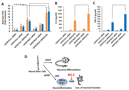 Effect of Bcl-2 depletion on LPS-induced IL-6 and TNF-α production in NSCs. (A) Control siRNA or Bcl-2 siRNA was transfected into the NSCs for 72 h, and then the cells were treated with LPS (1 μg/mL) for 12 h in the absence of bFGF. The mRNA levels of IL-6 and TNF-α were analyzed by real-time RT-PCR; n = 3. Data are shown as means ± SD. * p < 0.05 compared with –bFGF/control siRNA/LPS, for IL-6 and TNF-α, respectively. (B,C) Control siRNA or Bcl-2 siRNA was transfected into the NSCs for 72 h, and then the cells were treated with LPS (1 μg/mL) for 24 h in the absence of bFGF. The levels of IL-6 (B) and TNF-α (C) were measured by ELISA. Data are shown as means ± SD. * p < 0.05 compared with –bFGF/control siRNA/LPS. (D) The proposed model for Bcl-2-mediated neuronal differentiation in LPS-treated NSCs. The model suggests that Bcl-2 plays a neuroprotective role in LPS-induced neuroinflammation of NSCs, resulting in neuronal differentiation. Statistical significances were assessed by one-way ANOVA with a post hoc Tukey’s test.