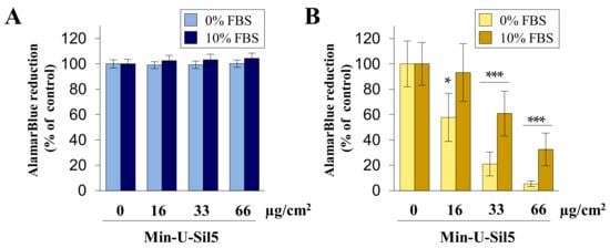 Metabolic activity of A549 (A) and dTHP-1 (B) cells after submerged exposure to Min-U-Sil5. A549 cells and dTHP-1 cells were treated with 0, 16, 33, or 66 µg/cm2 Min-U-Sil5 (0, 50, 100, or 200 µg/mL) either with or without FBS for 24 h. The cells were analyzed for AlamarBlue reduction which is shown relative to the untreated control (100%). The means ± SD of three independent experiments performed in duplicates are displayed. Statistical analysis was performed to assess differences between the cells cultured in media with and without FBS using student’s t-test: * (p ≤ 0.05), *** (p ≤ 0.001).