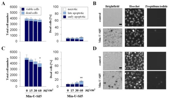 Proliferation and cell death of A549 cells after submerged exposure to Min-U-Sil5 in the absence (A,B) or presence of FBS (C,D). A549 cells were treated with 0, 15, 30, and 60 µg/cm2 Min-U-Sil5 (0, 50, 100, and 200 µg/mL) for 24 h. The cells were stained with Hoechst and PI and analyzed by automated high-throughput microscopy (AHM). Shown is the total cell number divided into living and dead cells and the percentage of dead cells (A,C) relative to the total cell number divided into apoptotic (condensed chromatin), late apoptotic (condensed chromatin + PI-positive), and necrotic cells (PI-positive). The means ± SD of one representative experiment out of two each performed in quadruplicates are displayed. Representative images of cells exposed to 200 µg/mL Min-U-Sil5 are shown (B,D). Statistical analysis was performed to assess differences between treated and untreated cells using student’s t-test: * (p ≤ 0.05), ** (p ≤ 0.01). Scale bar: 20 µm.
