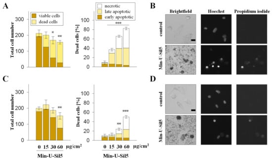 Proliferation and cell death of dTHP-1 cells after submerged exposure to Min-U-Sil5 in the absence (A,B) or presence of FBS (C,D). dTHP-1 cells were treated with 0, 15, 30, or 60 µg/cm2 Min-U-Sil5 (0, 50, 100, or 200 µg/mL) for 24 h. The cells were stained with Hoechst and PI and analyzed by AHM. Shown is the total cell number divided into living and dead cells and the percentage of dead cells (A,C) relative to the total cell number divided into apoptotic (condensed chromatin), late apoptotic (condensed chromatin + PI-positive), and necrotic cells (PI-positive). The means ± SD of one representative experiment out of two each performed in quadruplicates are displayed. Representative images of cells exposed to 200 µg/mL Min-U-Sil5 are shown (B,D). Statistical analysis was performed to assess differences between treated and untreated cells using student’s t-test: * (p ≤ 0.05), ** (p ≤ 0.01), *** (p ≤ 0.001). Scale bar: 20 µm.