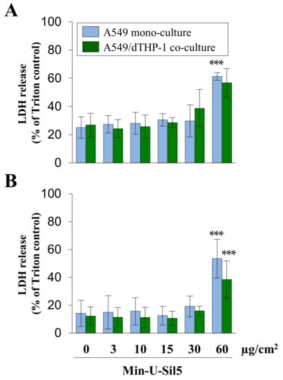 Assessment of cytotoxicity in A549 mono- and A549/dTHP-1 co-cultures after submerged exposure to Min-U-Sil5 in the absence (A) or presence of FBS (B). A549 cells were seeded with a density of 2 × 105/cm2. After 4 h, dTHP-1 cells (2.95 × 104/cm2) were seeded on top of the A549 cells for co-culture treatment. On the next day, mono- and co-culture were treated with 3, 10, 15, 30, or 60 µg/cm2 (3, 9, 30, 45, 90, or 180 µg/mL) Min-U-Sil5 for 24 h. The supernatants were analyzed for LDH release. LDH release is depicted relative to the Triton control (100%). The means ± SD of at least three independent experiments performed in duplicates are displayed. Statistical analysis was performed to assess differences between treated and untreated cells using student’s t-test: *** (p ≤ 0.001).