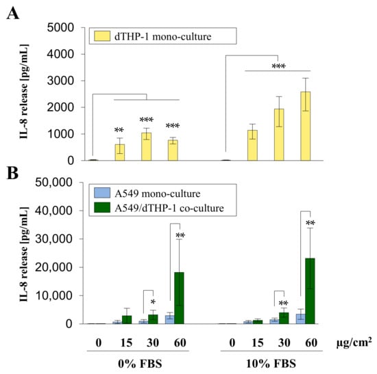 Interleukin-8 (IL-8) release from A549 and dTHP-1 mono-cultures as well as A549/dTHP-1 co-cultures after submerged exposure to Min-U-Sil5. A549 and dTHP-1 cells were seeded as monocultures at a density of 2 × 105/cm2 and 2.95 × 104/cm2, respectively (A,B). A549 cells were seeded with a density of 2 × 105/cm2. After 4 h dTHP-1 cells (2.95 × 104/cm2) were seeded on top of the A549 cells for co-culture treatment (B). The next day, mono- and co-cultures were treated with 45, 90, or 180 µg/mL (15, 30, or 60 µg/cm2) Min-U-Sil5 either in the presence or absence of FBS for 24 h. The supernatants were analyzed for IL-8 release. The means ± SD of three independent experiments performed in duplicates are displayed. Statistical analysis was performed to assess differences between untreated and treated cells (dTHP-1) and differences between mono- and co-cultures (A549, A549/dTHP-1) using student’s t-test: * (p ≤ 0.05), ** (p ≤ 0.01), *** (p ≤ 0.001).