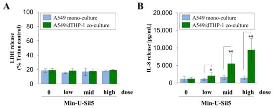 2.3. Co-Cultures of A549 and dTHP-1 Cells Show Similar Sensitivity towards Min-U-Sil5 as the Corresponding A549 Mono-Cultures