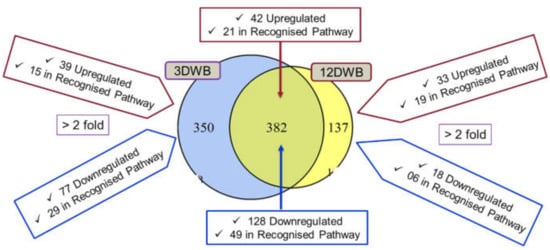 Of these, 15 and 19 proteins were detected in recognised protein pathways in 3dwb and 12dwb, respectively (Figure 1). In contrast, 77 and 18 proteins were significantly (> 2-fold) downregulated in 3dwb and 12dwb, respectively. Of these, 29 and 6 proteins were detected in recognised protein pathways in 3dwb and 12dwb, respectively (Figure 1). Among the common proteins between 3dwb and 12wb, 42 proteins were significantly upregulated (>2-fold), of which 21 proteins were involved in recognised pathways, and 128 proteins were significantly downregulated (>2-fold), of which 49 proteins were involved in recognised pathways (Figure 1).