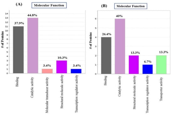 Classification of the unique/exclusive differentially regulated proteins of 3dwb and 12dwb based on their functional annotations using Gene Ontology. (A) GO Molecular Function for 3dwb; (B) GO Molecular Function for 12dwb.