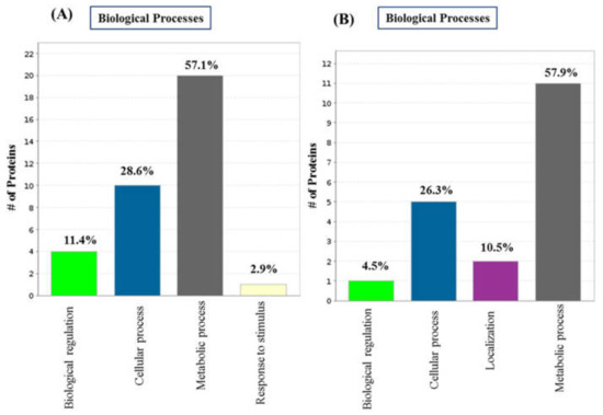 Biological process evaluation identified the four most represented biological processes (Figure 3) for both 3dwb and 12dwb. Of the proteins significantly upregulated/downregulated > 2-fold, 20 proteins (57.1%) were involved in metabolic processes, 10 proteins identified (28.6%) in cellular processes, and 4 proteins (11.4%) were involved in biological regulations in 3dwb. In the 12-day biofilm, a similar percentage of proteins involved metabolic processes. 11 proteins (57.9%) and 5 proteins (26.3%) were involved in cellular processes; in contrast, two proteins (10.5%) were involved in localisations. These results suggest that more proteins are involved in metabolic processes in 3dwb compared with 12dwb.