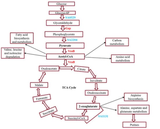In addition, we observed 2-oxoglutarate ferredoxin oxidoreductase subunit alpha (SA1131) was significantly downregulated in 3dwb. This enzyme is involved in multiple pathways including pyruvate metabolism and tricarboxylic acid (TCA) cycle and is vital for the reductive TCA cycle which takes the opposite shape of the TCA cycle and is primarily disseminated in anaerobic autotrophs. 2-oxoglutarate ferredoxin oxidoreductase catalyses the carbon dioxide fixation reaction to succinyl-CoA, resulting in 2-oxoglutarate production (Figure 4). This reaction needs strong reducing power (occurs in a reducing environment), and ferredoxin plays an important role in maintaining this redox balance. Studies have reported that 2-oxoglutarate ferredoxin oxidoreductase is important for maintaining bacterial growth under anaerobic conditions [30], and it also plays a role as a source for low-potential electron equivalents for nitrogen fixation [31]. A study by Dorner et al. (2002) reported that 2-oxoglutarate ferredoxin oxidoreductase plays a pivotal role in the metabolism of aromatic compounds in the absence of molecular oxygen by catalysing the transfer of two electrons from decreased ferredoxin to benzoyl-CoA driven by ATP. They described that reducing the benzene ring is a cycle that is energetically and mechanistically hard and needs exceptionally low redox potential and ferredoxin functions as an electron shuttle between the TCA cycle and benzoyl-CoA reductase by combining the oxidation of the benzoyl-CoA pathway end product, acetyl-CoA, with the decrease in the aromatic ring [31]. Therefore, it can be concluded that the identified proteins involved in the central metabolism pathways maintain biofilm growth under diverse environments by providing an alternative metabolic route to utilize energy.