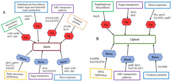 Proteomic profiling analysis at various phases of biofilms highlighted interesting findings on metabolic processes, biosynthetic processes, transport systems such as sugar and ABC transporters, and stress response (e.g., gap, nanE, nasD, SA1692) involved in S. aureus biofilm formation (Figure 5).
