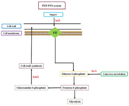 For instance, the upregulation of 3-phosphoshikimate 1-carboxyvinyltransferase (aroA) involved in the shikimate pathway shows an enhanced synthesis of aromatic amino acids in 3dwb. Some studies demonstrated that aroA production can result in glyphosphate resistance in pathogenic bacteria such as S. aureus and the plant pathogen Burkholderia glumae’s growth, virulence, and UV tolerance [42,43,44]. This suggests that a higher accumulation of glyphosphate in biofilm may show increased resistance levels to glyphosphate and virulence mechanisms, probably resulting in enhanced biofilm formation. PIA is a major component of the biofilm matrix, and its formation also depends on the phosphotransferase system (PTS) a distinct method used by bacteria to uptake sugar. The phosphoenolpyruvate-protein (PEP) PTS is a carbohydrate-specific active transport mechanism and is responsible for transporting sugar substrates (such as glucose, lactose, fructose, and cellobiose) during translocation across the cell membrane. We observed interesting findings with sugar transporter systems such as PTS, upregulation of lactose-specific transporter subunits IICB (lacE), galactose-6-phosphate isomerase (lacA) involved in galactose metabolism (Figure 6). Inhibition of PTS systems has been shown to reduce the virulence of S. aureus in a murine model [45]. Aminoacyltransferase (femX) is involved in peptidoglycan biosynthesis, by incorporating L-amino acids into the interchain cross-bridge of peptidoglycan chains, thus stabilizing the peptidoglycan [46] and was upregulated in the 12-day old biofilm (Figure 6).