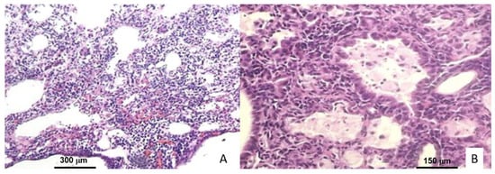 Histological micrographs of Balb/C mice lung after 28 days of infection with M. tuberculosis H37Rv. (A) Extensive inflammatory infiltrates, granulomas, and pneumonic areas (40× magnification). (B) Foamy and epithelioid cells (400× magnification).