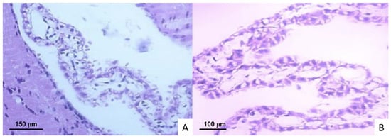 Histological micrographs of Balb/C mice choroid plexus. (A) 28 and (B) 60 DPI with M. tuberculosis H37Rv ependymal cells with inflammatory characteristics, cytoplasmic vacuolation, and architectural distortion (400× and 600× magnification, respectively).