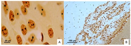 Histological micrographs of encephalon from Balb/C mice infected with M. tuberculosis N15 (LAM3) strain. (A) Brain cortex neurons with nuclei retraction, loss of chromatin, nucleolus preservation, and evident AgNORs (400× magnification). (B) Ependymal cells of choroid plexus with inflammatory characteristics, cytoplasmic vacuolation, and architectural distortion. Bielschowsky stain at 40× magnification.
