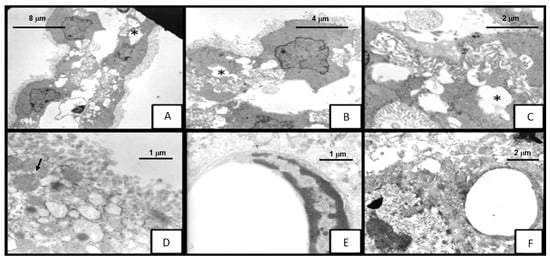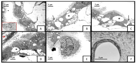 Transmission electron micrograph of brain tissue of mice infected with M. tuberculosis N15 (LAM 3) strain on day 3: the epithelial cells of the choroid plexus with evident alteration of the architecture; vacuolation of the more than 60% of the cell area; enlargement of the interdigitations and separation of the cells *. (A) ×2500, (B) ×5000, (C) ×10,000 (D) observed with increased vacuolation and mitochondria alteration (black arrow) ×12,500. (E) Frontal cortex blood vessel and ×12,500; (F) hippocampus blood vessel ×8000, without alterations of the architecture.