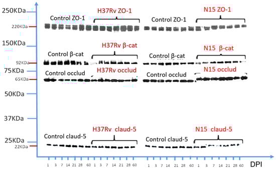 It has been shown that proinflammatory cytokines disrupt different epithelial barriers []. Therefore, we next investigated the effect of pulmonary infection with both strains of M. tuberculosis on the expression of several cell junctional proteins in the CNS. For this purpose, lysates obtained from the brain tissue of mice infected with the N15 or the H37Rv strain for 1–60 days were analyzed by western blotting. As shown in Figure 6, no changes in β-catenin and occludin were detected in any condition. However, downregulation of claudin-5 and ZO-1 was observed after 7 and 21 DPI, respectively, in the N15 strain. Interestingly, the reduction in these two proteins was accompanied by an increase in occludin. No changes in any cell junction proteins were perceived in the animals exposed to the H37Rv strain. Taken together, these results suggest that the N15 strain affects the cerebral protein expression of cell junctions.