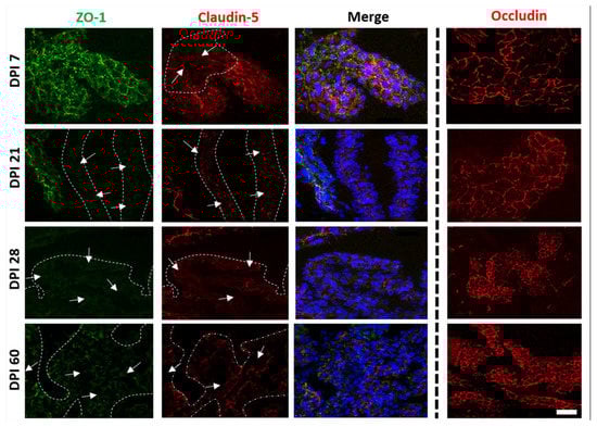 Temporal course of fluorescence immunolabeling for cell junctions in choroid plexus of mice infected with M. tuberculosis N15 (LAM 3) at different DPI. Arrows and dotted lines correspond to areas devoid of junctional proteins. The scale bar = 20 μm is common for all micrographs.
