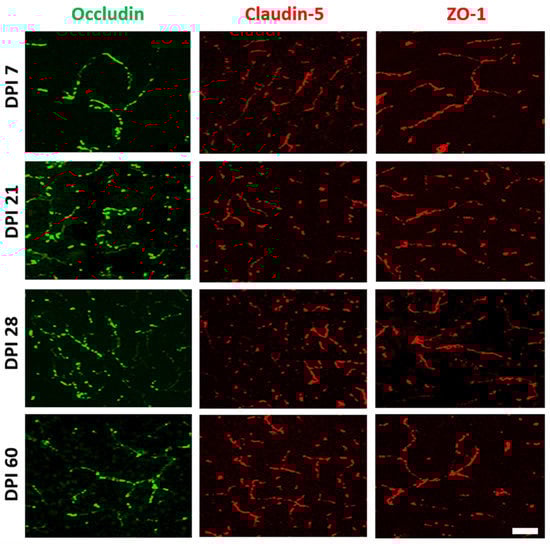 Conversely, and consistent with the results of western blot, the tissue sections from animals infected with the N15 strain showed an altered pattern, and a decreased expression of claudin-5 and ZO-1 was observed after 7 and 21 DPI, respectively, in the BCSFB (Figure 7). Such alterations consisted of diminished expression and changes in the localization of proteins within the cell. However, we observed reorganization and an augmented fluorescence signal in occludin after 60 days of exposure (Figure 7). No changes were found in the BBB (Figure 8).