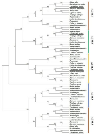 The neighbor-joining (NJ) method was used to analyze the sequence phylogeny of Acsls based on the amino acid sequences from seven fish species (Salmo salar, Oncorhynchus nerka, Astyanax mexicanus, Cyprinus carpio, Takifugu rubripes, Oryzias latipes, Latimeria chalumnae), two bird species (Parus major, Catharus ustulatus) and three mammal species (Monodelphis domestica, Mua musculus, Homo sapiens). The confidence of the phylogenetic tree-branch topology of Acsls was performed through 1000 bootstrap iterations.