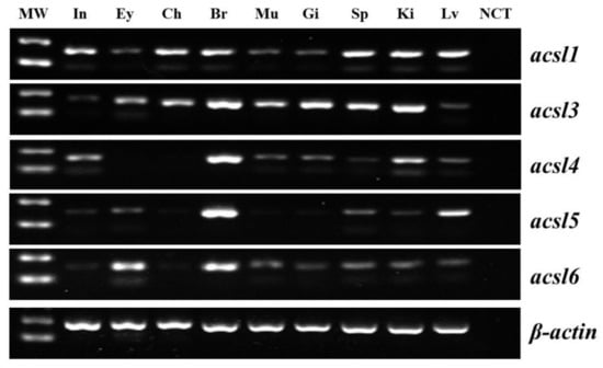 Tissue specificity of Trachinotus ovatus acsl family mRNA expression. Expression of the housekeeping gene β-actin is also shown. Abbreviations: MW, molecular weight marker; In, intestine; Ey, eyes; Ch, cholecyst; Br, brain; Mu, muscle; Gi, gill; Sp, spleen; Ki, kidney; Lv, liver; NCT, negative template control.