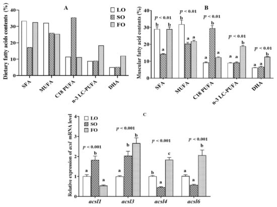 The effects of dietary lipid sources on muscle fatty acid composition and acsl mRNA expression are shown in Figure 3A–C. The detailed effects of dietary lipid sources on the muscle fatty acid composition were reported in our previous study []. The content of saturated fatty acid (SFA) was significantly higher in the fish fed LO and FO diets than that of fish fed SO diets (p < 0.05). The fish fed LO diets showed significantly higher muscular monounsaturated fatty acid (MUFA) levels than the other two groups (p < 0.05), while higher C18 polyunsaturated fatty acids (C18 PUFA), and n-3 LC-PUFA and DHA contents were detected in the fish fed with SO and FO diets, respectively (p < 0.05). Regarding the changes of muscular acsl mRNA expression level (Figure 3C), the expression of acsl1 mRNA levels in the fish fed SO diets was higher than that in the fish fed LO and FO diets (p < 0.05), while a high acsl3, acsl4 and acsl6 mRNA level was measured in the fish fed FO diets than that of fish fed LO or SO diets (p < 0.05).
