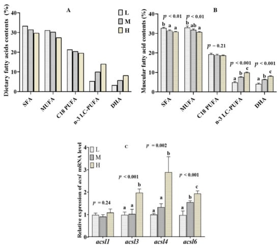 The fatty acid composition and acsl genes expression profile of T. ovatus fed diets with different n-3 LC-PUFA levels are shown in Figure 4A–C. The detailed effects of dietary n-3 LC-PUFA levels on the muscle fatty acid composition was reported in our previous study []. Briefly, the muscular n-3 LC-PUFA and DHA contents were gradually increased with increasing levels of dietary n-3 LC-PUFA (p < 0.05), while the contents of SFA and MUFA decreased accordingly in the muscle (p < 0.05) (Figure 4B). Accordingly, the high mRNA expression levels of acsl3, acsl4 and acsl6 were measured in the muscle of fish fed with high n-3 LC-PUFA diets (p < 0.05) (Figure 4C).