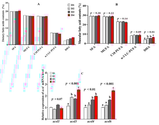 Muscular fatty acid contents (B), and acsl family mRNA relative level (C) of juvenile Trachinotus ovatus fed diets with different DHA levels (A). Values are means ± SEM from three treatments of fish (n = 3) with three fish per cage, and bars not sharing a common letter indicated significant differences (p < 0.05) among deletions determined by one-way ANOVA followed by Tukey’s multiple comparison.