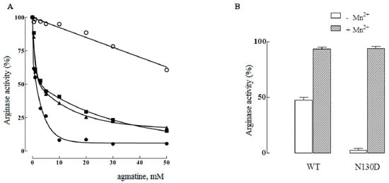 - Alarcón, R.; Orellana, M.S.; Neira, B.; Uribe, E.; García, J.; Carvajal, N. Mutational analysis of substrate recognition by human arginase type I—Agmatinase activity of the N130D variant. FEBS J. 2006, 273, 5625–5631. [Google Scholar] [CrossRef]