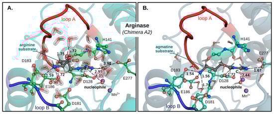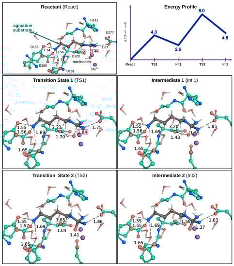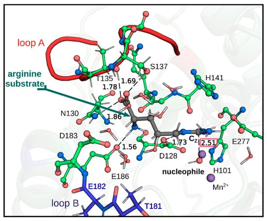 - Saito, T.; Kawakami, T.; Yamanaka, S.; Okumura, M. QM/MM study of hydrolysis of arginine catalysed by arginase. Mol. Phys. 2016, 114, 431–439. [Google Scholar] [CrossRef]