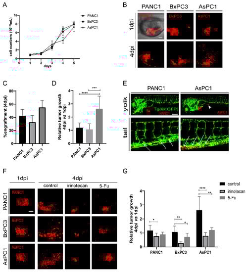 The pancreatic cancer cells show differential engraftment profile in zebrafish. (A) The growth curve of in-vitro cultured PANC1, BxPC3, and AsPC1 cells. (B) Representative confocal images of PANC1, BxPC1, and AsPC1 xenografts at 1 dpi and 4 dpi. (C) Engraftment quantification for PANC1, BxPC1, and AsPC1 cells at 4 dpi. Results are shown as means ± SEM from 50 different individuals. (D) Relative tumor growth (4 dpi vs. 1 dpi) for PANC1, BxPC3, and AsPC1 xenografts. Results are from nine different individuals (*** p < 0.001, **** p < 0.0001, t test). (E) PANC1 and AsPC1 showed metastasis in the intestine (white arrowheads) and in the caudal hematopoietic tissue (white arrows). (F) Representative confocal images of PANC1, BxPC3, and AsPC1 xenografts at 1 dpi or at 4 dpi after DMSO (control), irinotecan (50 μM) or 5-Fu (2 mM) treatment. (G) Relative tumor growth (4 dpi vs. 1 dpi) for PANC1, BxPC3, and AsPC1 xenografts after treatment with DMSO, irinotecan or 5-Fu. Results are from nine different individuals (* p < 0.05, ** p < 0.01, ***p < 0.001, **** p < 0.0001, t test). dpi, days post injection. Scale bars in (B,F), 50 µm; in (E), 75 µm.