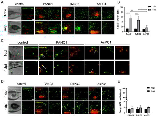 Next, we used Tg(mpeg1: GFP) to visualize the macrophage reaction to different cancer cells []. However, due to the weak fluorescence, we barely detected green-colored macrophages in zebrafish xenografts. We then used Tg(mpx: GFP) to visualize the behavior of neutrophils []. At 4dpi, PANC1, BxPC3, and AsPC1 all recruited comparable neutrophils to the tumor, and to a much lesser degree compared to coro1a: GFP+ cells. In addition, the co-localization of neutrophils with cancer cells was not changed from 1 dpi to 4 dpi for all three cell lines (Figure 2D,E). Comparing the different responses of coro1a: GFP+ and mpx: GFP+ cells in in zebrafish xenografts, we hypothesize that macrophages might be the major population that quickly respond to the pancreatic cancer cells in the TME.