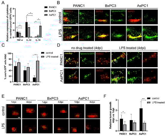 The transplanted cancer cells could instruct innate immune cells to pro-tumoral and anti-tumoral states that produce distinct cytokines. We examined the cytokine expression of coro1a: GFP+ cells in PANC1, BxPC3, and AsPC1 xenografted larvae. We sorted coro1a: GFP+ cells from the xenografts at 4 dpi and examined the representative cytokine expression by quantitative PCR (qPCR). Compared to PANC1 and BxPC3 tumor, coro1a: GFP+ cells from AsPC1 xenografts expressed a low level of TNF-α and IL-12, and a higher level of IL-10 (Figure 3A). These results support the idea that AsPC1 cells might induce innate immune cells to a pro-tumoral state, while PANC1 and BxPC3 induce an anti-tumoral state. Previous reports have demonstrated that lipopolysaccharide (LPS) can activate innate immune cells into an anti-tumoral state in zebrafish [,]. We then used LPS to modulate the innate immune cell states in the xenografts. LPS treatment led to a significant increase of co-localization of innate immune cells with PANC1, BxPC3, and AsPC1 cells, particularly for AsPC1 (Figure 3B,C). We also noted that an increased phagocytosis of AsPC1 cells by immune cells after LPS induction (Figure 3D). LPS did not influence the growth of PANC1, BxPC3, and AsPC1 cells in vitro at various concentrations (Figure S3). After 3 days of LPS treatment in transplanted larvae, PANC1 and BxPC3 presented an average 20–30% decrease in the tumor size, while AsPC1 showed a remarkable 60% tumor reduction (p < 0.001, Figure 3E,F). These results together supported that AsPC1 likely induced innate immune cells into pro-tumor state to promote tumor growth, and LPS treatment activated innate immune cells and regressed tumor growth.