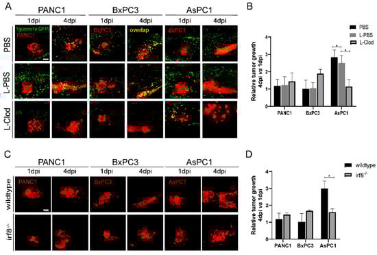 Zebrafish innate immune cells regulate PANC1, BxPC3, and AsPC1 tumor progression. (A) Representative confocal images of PANC1, BxPC3, and AsPC1 xenografts in embryos co-injected with PBS, L-PBS or liposome-clodronate (L-clodronate) at 1 dpi and 4 dpi. (B) Relative tumor cell growth for PANC1, BxPC3, and AsPC1 in PBS, L-PBS, or L-clodronate-treated groups. Results are from nine different individuals (* p < 0.05, t test). (C) Representative confocal images of PANC1, BxPC3, and AsPC1 xenografts in WT and irf8−/− mutant embryos at 1 dpi and 4 dpi. (D) Relative tumor growth of PANC1, BxPC3, and AsPC1 in WT and irf8−/− mutant embryos. Results are shown as means ± SEM from nine different individuals (* p < 0.05, t test). dpi, days post injection. Scale bar, 50 µm.