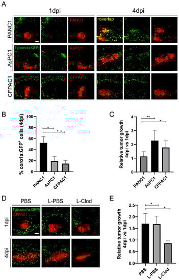 We next examined the direct function of innate immune cells in tumor growth. Since macrophages likely play important roles in our system, we used the liposome-clodronate (L-clodronate) to primarily deplete macrophage in zebrafish larvae as used in previous studies [,]. We observed a strong reduction of coro1a: GFP+ innate immune cells particularly in the TME (Figure 4A), supporting the fac that these cells are likely macrophages. More importantly, with the treatment of L-clodronate, the tumor sizes of PANC1 and BxPC3 were slightly increased, but AsPC1 tumor size was decreased by 70% (Figure 4B).