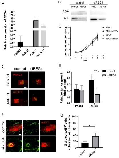 Knockdown of REG4 in cancer cells suppresses tumor growth and activates innate immune response in zebrafish. (A) Relative expression of REG4 mRNA in PANC1, BxPC3, AsPC1, and CFPAC1 cells. (B) Western Blotting of REG4 and Actin in PANC1 and AsPC1 cells transfected with the control or REG4 siRNA. (C) The growth curve of in-vitro culture of PANC1 and AsPC1 cells transfected with the control or REG4 siRNA. (D) Representative confocal images of PANC1 and AsPC1 cells transfected with the control or REG4 siRNA in zebrafish xenografts at 4 dpi. (E) Relative tumor growth (4 dpi vs. 1 dpi) of the control tumor cells or cells with REG4 silencing. Results are shown as means ± SEM from nine different individuals (*** p < 0.001, t test). (F) Representative confocal images of ASPC1 cells in the control or REG4-silencing group in Tg(coro1a: GFP+) zebrafish. (G) Quantification coro1a: GFP+ innate immune cell percentage in AsPC1 tumor in the control and REG4-silencing groups. Results are from nine different individuals (* p < 0.05, t test). dpi, days post injection. Scale bars, 50 µm.