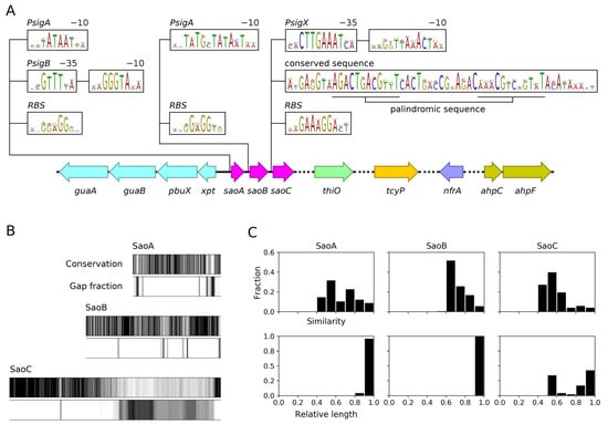 The saoABC operon is prevalent among and exclusive to staphylococci and displays unique sequence characteristics. Knowing that saoC transcript possibly avoids endoribonucleolytic activity of PemK-Sa1 toxin, which suggested that it could potentially be implicated in the stress response [28], and also knowing from a preliminary analysis that the gene codes for a hypothetical and likely DNA-binding protein, we decided to undertake an investigation into the function of SaoC. We started the research with a thorough analysis of the genetic neighbourhood of saoC and the search for sequences coding for homologous proteins in other bacteria. That led to the identification of saoABC operon, which codes for three hypothetical proteins (SaoA, SaoB and SaoC), and is present exclusively in bacteria of the Staphylococcus genus. The analysis of whole genome sequencing (WGS) results available in the GenBank database for 51 different staphylococcal species allowed us to trace the operon’s presence to 47 of them (Supplementary List S1). Detailed comparative analysis of sequences derived from those species revealed that in the closest, most conserved neighbourhood of saoABC operon when moving upstream there are: an operon of four genes coding for xanthine phosphoribosyltransferase (xpt), purine permease (pbuX), IMP dehydrogenase (guaB) and glutamine-hydrolyzing GMP synthase (guaA), all found in 46 species; when moving downstream: a gene coding for glycine oxidase (thiO) found in 13 species, L-cystine transporter (tcyP) and oxygen-insensitive NADPH nitroreductase (nfrA) both found in 44 species, as well as an operon coding for alkyl hydroperoxide reductase subunits C (peroxiredoxin, ahpC) and F (ahpF) found in 43 species. The downstream neighbourhood, in contrast to the upstream one, is to some extent variable and next to the aforementioned genes others occur on species-specific basis (Figure 1A).
