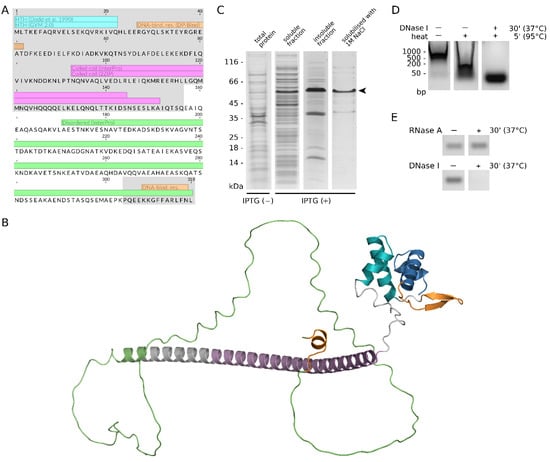 SaoC is a DNA-binding protein. (A) In the SaoC sequence from S. aureus it is possible to detect different DNA-binding motifs (HTH, skyblue; coiled coil, magenta) and extents of residues (orange) by using different available tools (GYM 2.0, NPS@ tool based on Dodd and Egan, DP-Bind, 2ZIP, InterPro Scan). Notably, all these motifs are located in the parts of SaoC that are highly conserved among different staphylococcal species, whereas the highly variable SaoC part is predicted to be of unordered structure (green). (B) Some of the predictions made by the aforementioned tools align with SaoC structure as modelled by AlphaFold. The N-terminal part starts with a HTH motif (blue), followed by a β-sheet corresponding to predicted DNA-binding residues (orange), and another, not predicted before, HTH motif (cyan). The region initially predicted as a coiled coil (magenta) is α-helical in the model, which may indicate the possible presence of a coiled coil tertiary structure. Most of the remaining part of SaoC remains unordered, similarly to the initial prediction (green). The C-terminal motif, which was predicted to contain DNA-binding residues (orange), is an exception as it is modelled as a short α-helix. (C) SaoC when produced in E. coli exhibits properties typical for DNA-binding proteins. It migrates slower in SDS-PAGE than expected by its molecular mass and forms aggregates that may be solubilised with 1 M NaCl. (D) The solubilised samples of SaoC contain nucleic acids as evidenced in agarose gel electrophoresis. They might be released from complexes with SaoC by thermal denaturation. If treated with DNAse I beforehand, short fragments are protected from digestion. (E) The short nucleic acid fragments are degraded by DNAse I but not by RNAse A, which shows they are in fact DNA fragments.