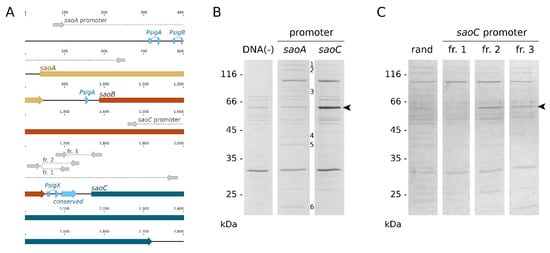 SaoC binds within the uncharacterised conserved motif upstream of its own gene. (A) The scheme showing which fragments of saoABC operon were used in the experiment and which conserved motifs they encompassed. Next to two major regions covering vast extents of putative promoter regions of saoA and saoC, three shorter fragments of the latter were used to narrow down the region bound by SaoC. (B) SDS-PAGE of protein samples from DNA pull-down assays performed on the two major putative promoter regions of saoA and saoC and whole-cell S. aureus lysates. When compared to the control without DNA, the major fragment of saoC promoter is bound by SaoC protein as confirmed by mass spectrometry. In the case of the saoA promoter region, no evident binding is detectable in applied conditions. The identity of a few differentiating bands (1–5) points at general DNA-binding proteins or their fragments (1, single-stranded DNA-binding protein; 2, 3′–5′ exoribonuclease YhaM; 3, type I DNA topoisomerase; 4, DNA polymerase I; 5, RNAP β’ subunit; 6, RNAP β subunit). (C) SDS-PAGE of protein samples from DNA pull-down assays performed correspondingly on the three shorter fragments of the putative saoC promoter region. Only the fragments containing the uncharacterised conserved region are bound by SaoC. The control used here was a randomly shuffled fragment of the saoC putative promoter sequence.