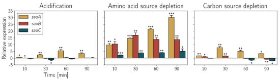 Expression changes of saoABC operon genes in S. aureus CH91 strain manifested reproducibly in three distinctive stress conditions, including acidification as well as depletion of amino acid or preferential carbon sources, measured with RT-qPCR (n = 3) in reference to transcripts of gyrase B (gyrB). In all conditions, particularly elevated expression of saoA is observed. Similar changes are observed for saoB in the case of amino acid source depletion. Preferential carbon source depletion leads to decreased expression of saoB and saoC. * p ≤ 0.050, ** p ≤ 0.010, *** p ≤ 0.001.