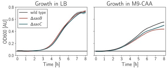 Growth dynamics of RN4220 strain knockout mutants of saoABC operon genes. In rich media there is not any difference in growth dynamics (plot on the left). However, in less optimal M9-CAA, ΔsaoB and ΔsaoC manifest slower growth and reach lower densities by around 20 and 10%, respectively, when compared to wild type RN4220 (plot on the right). The standard deviation of measurements (n = 3) is depicted as shaded bands.