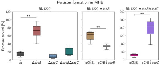 Persister formation by RN4220 strain knockout mutants of saoABC operon genes. Significant differences (n = 6) are observed only between wild type (wt) RN4220 and RN4220 ΔsaoB (plot on the left). The null mutant is characterised by around 4-fold increased survival during exposure to penicillin. The effect is to some extent reversed by complementation of RN4220 ΔsaoB with pCN51 plasmid vector containing saoB controlled by a cadmium-inducible promoter (plot in the middle). Importantly, no statistically significant increase in survival is observed between the wild type RN4220 and RN4220 ΔsaoC, or the double mutant RN4220 ΔsaoBΔsaoC (plot on the left). However, cadmium-induced expression of saoC in the double mutant significantly increases persister formation (plot on the right). ** p ≤ 0.010.