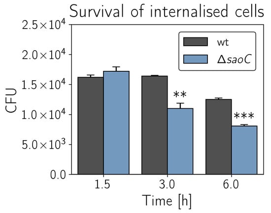 Survival of RN4220 strain knockout mutant ΔsaoC in human dermal fibroblasts. RN4220 ΔsaoC reproducibly manifests decreased survival of cells internalised to human fibroblasts (n = 3). The survival is lower by 25–30% to that of the wild type RN4420 in the third and sixth hour after exposure of fibroblasts to bacterial cells. ** p ≤ 0.010, *** p ≤ 0.001.