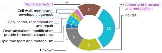 Representation of genes involved in different cellular processes among those differentially expressed in the logarithmic growth phase in RN4220 ΔsaoC when compared to the wild type. Although a small number of differences (30 loci) may be observed, a general trend emerges that differentially expressed loci are mostly linked to basic metabolism or virulence. Genes related to amino acid transport and metabolism, as well as virulence factors, are significantly over-represented. The number of differentiating loci is given on each slice. ** p ≤ 0.010, *** p ≤ 0.001.