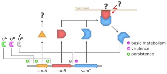 Possible regulatory pathways governing functions of saoABC operon. Promoter sequences of saoABC operon, next to constitutive promoters for σA, contain also one for σB. The latter likely increases transcription in stress conditions, not to turn on the SaoC-related system but in order to regenerate SaoA and SaoB proteins and deactivate released SaoC. Functional links between saoABC operon and other, yet uncharacterised, regulatory systems may exist, which is indicated by the presence of conserved but unknown sequence motifs upstream of saoC. It is highly likely that SaoC is a transcription repressor that autoregulates the transcription of its own gene in a negative feedback loop. SaoC is engaged in regulation of the expression of genes related to basic and mostly protein metabolism, but also of genes of virulence factors. The general result of its action seems to be metabolic suppression, virulence attenuation and persister formation. SaoB is highly likely an antagonist of SaoC, and might be a membrane-attached protein that keeps SaoC inactive in a membrane-bound state. Functions of SaoA still remain unknown. The role of SaoA and the nature of SaoB, as well as molecular mechanisms underlying interactions among them and SaoC, are yet to be determined.