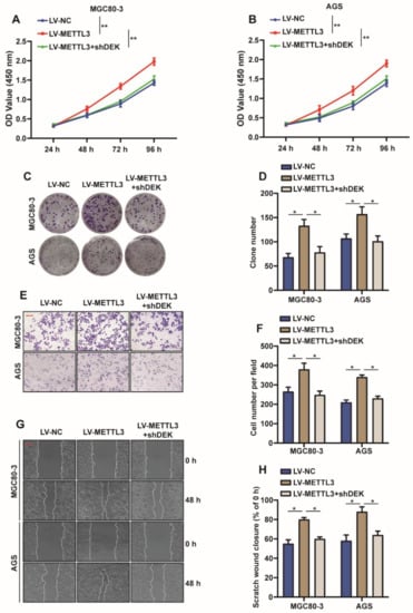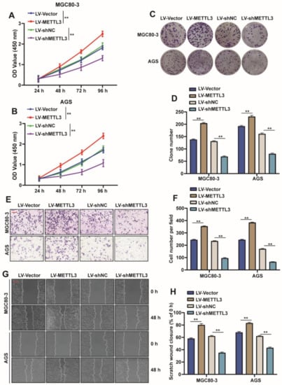 2.2. METTL3 Promotes the Proliferation and Migration of GC Cells