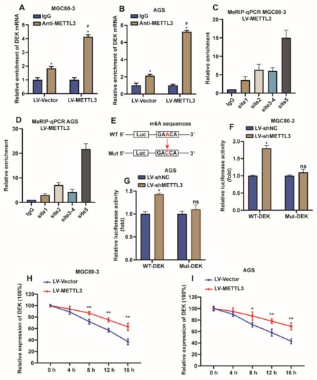 Chicago/Turabian StyleZhang, Hui-Min, Fei-Fei Qi, Jun Wang, Yuan-Yuan Duan, Li-Li Zhao, Yun-Dan Wang, Tong-Cun Zhang, and Xing-Hua Liao. 2022. "The m6A Methyltransferase METTL3-Mediated N6-Methyladenosine Modification of DEK mRNA to Promote Gastric Cancer Cell Growth and Metastasis" International Journal of Molecular Sciences 23, no. 12: 6451. https://doi.org/10.3390/ijms23126451