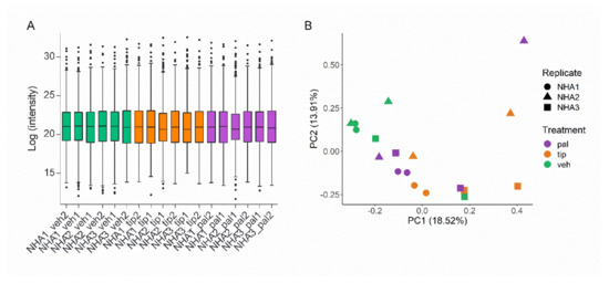 Protein expression profile in normal human astrocytes (NHA) under lipotoxic treatments. Three biological (NHA 1 to 3) and two technical replicates were cultured in medium alone (veh), medium containing palmitic acid (pal), or medium containing tibolone 10 nM pre-treatment and palmitic acid 2 mM (tip). (A) Tukey boxplot of Protein abundance by sample, normalized with VSN method. (B) Principal component analysis (PCA) to evaluate the relationships between biological replicates and treatments. Green: veh samples, orange: tip samples, and violet: pal samples.