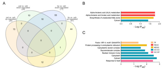 Differentially expressed proteins were compared in the case of pal vs. veh and tip vs. veh. Worth of note, 31 proteins were found regulated in both comparisons (Table 1). These proteins presented the same expression pattern, except for SRP68 or t“e“ signal recognition particle subunit SR”68” that changed from a down-regulation in the pal vs. veh to up-regulation in tip vs. veh (Figure 5A). Notably, when observing the shared proteins between the tip vs. veh and pal vs. veh comparisons, it is found that the up-regulated proteins show enrichment for the synthesis of unsaturated FAs such as alpha-linoleic acid, suggesting that their synthesis is augmented in both treatments that involve PA (Figure 5B). Among the down-regulated proteins, we found an enrichment in cytoplasmic dynein complex (p_adj = 2.90 × 10−2), response to heat (p_adj = 3.25 × 10−3), and protein processing in RE (p_adj = 9.74 × 10−3) (Figure 5C).
